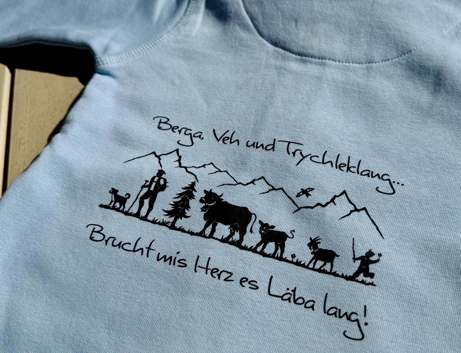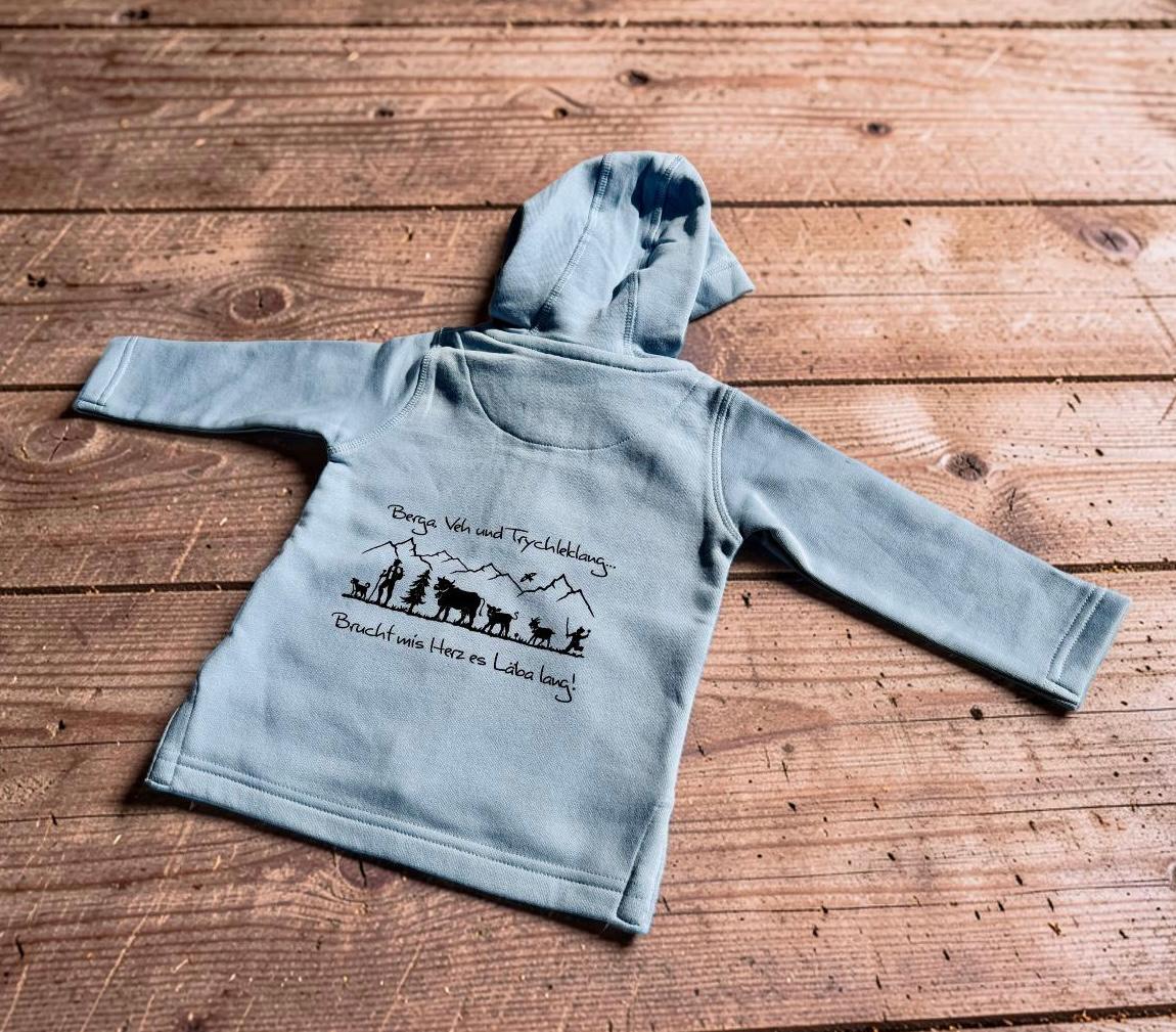 Diese liebevoll gestaltete Kinderjacke ist mehr als nur ein Kleidungsstück – sie ist ein Statement für Verbundenheit zur Natur und zum Landleben. Der hochwertige Rückenprint zeigt eine detailreiche Silhouette mit Bergen, Bauer, Tieren und Natur – begleitet vom Schriftzug „Berge, Veh und Trychleklang… Brucht mis Herz es Läba lang!“.