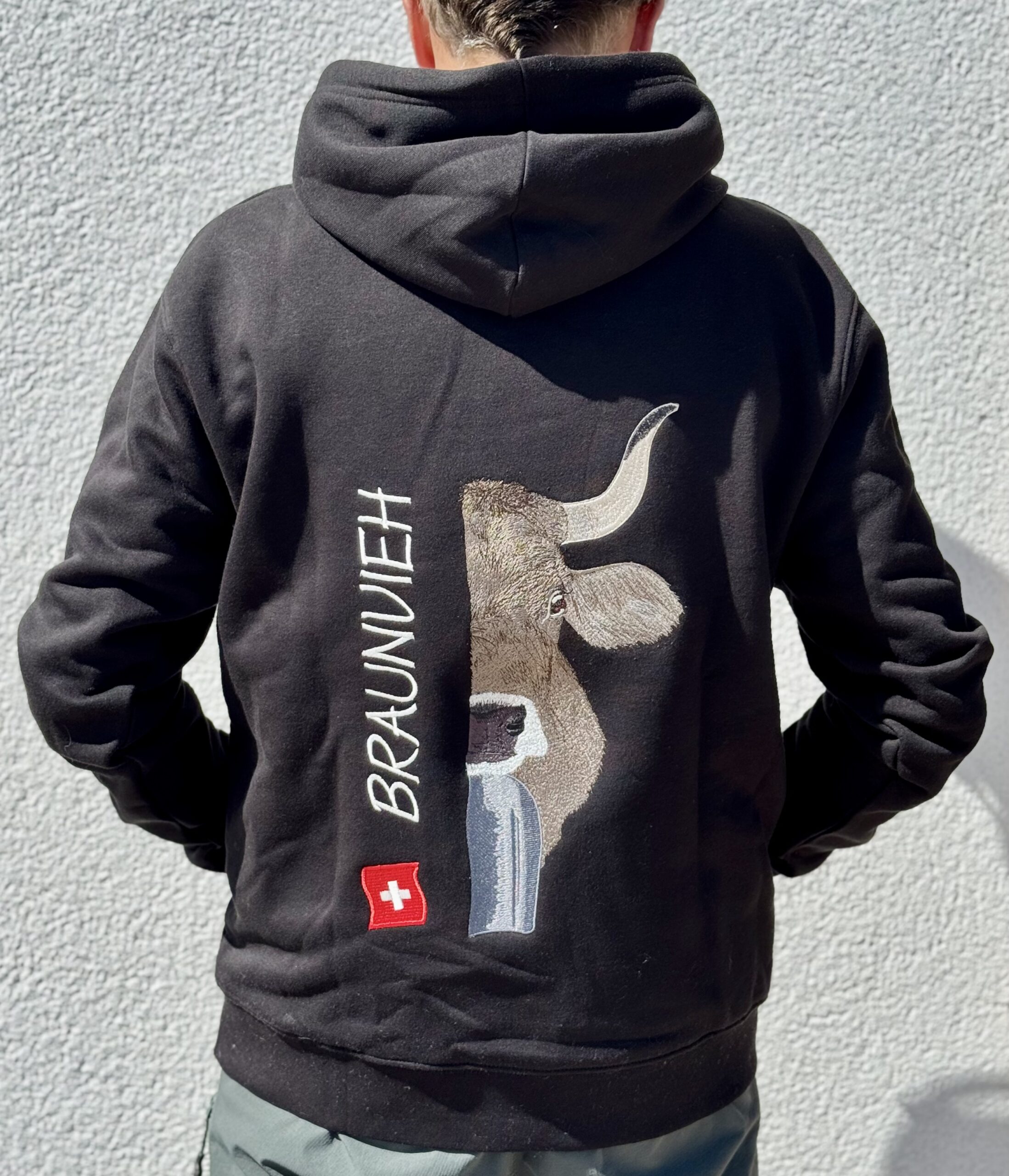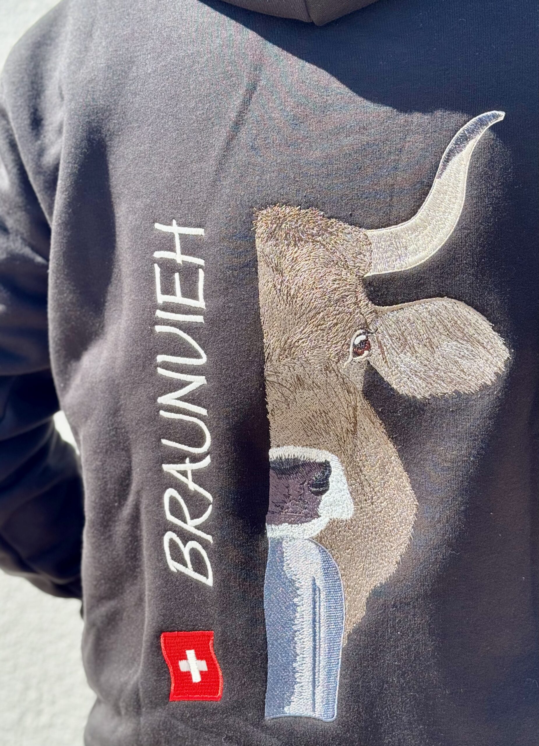 - Grosse, detailreiche Braunvieh-Stickerei auf dem Rücken